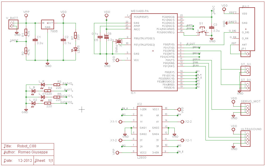 Vengono poi ottenuti 5V stabilizzati da un LM7805: questi 5V andranno ad alimentare il microcontrollore, la parte a bassa potenza dell’L293D, il modulo ad ultrasuoni, il servomotore ed il ricevitore radio.