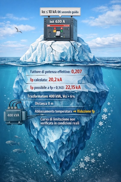 Noi non sappiamo in dettaglio con quali fattori di potenza siano state condotte le prove di limitazione per la corrente di picco e dell’energia passante dell’interruttore che la guida propone di utilizzare come interruttore generale e che a sua volta determina la corrente di cortocircuito condizionata. Sicuramente però sono state condotte ai fattori di potenza convenzionali, che sono più alti di quelli in gioco effettivamente. Quindi non in condizioni cautelative per il caso in esame. Addirittura a nostro parere si dovrebbe prendere in considerazione la possibilità che il fattore di potenza possa ulteriormente scendere ad un valore pari a 0,143 con una corrispondente corrente di picco Ip di cortocircuito pari a 22,15 kA (ben maggiore di 17 kA). Questi ultimi valori possono concretizzarsi al ravviamento dell’impianto dopo una opportuna pausa d’inverno a circa 0°C di temperatura ambiente.