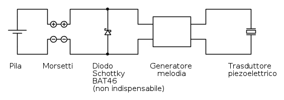 Per evitare danni al generatore di melodia nel caso in cui la pila venisse collegata con polarità invertita, io ho saldato un piccolo diodo Schottky (un BAT46, che appare come un cilindretto azzurro nelle foto) in parallelo, tra le piazzole dove ho saldato i fili di alimentazione del generatore di melodia, rivolgendo il catodo (indicato da una fascetta nera) verso il positivo. In questo modo il diodo non conduce e non interferisce nel funzionamento quando la polarità è applicata correttamente, mentre passa in conduzione cortocircuitando la pila in caso di inversione di polarità. Un BAT46 regge una corrente di 150 mA, quindi non viene danneggiato dalla debole corrente di cortocircuito della nostra pila, ed essendo uno Schottky presenta ai suoi capi (in polarizzazione diretta) una d.d.p. di soli 0,25 V, che non può danneggiare il generatore di melodia anche se presentata con polarità invertita. È bene inserire il diodo in parallelo all'alimentazione come ho fatto io, e non in serie, per non introdurre una caduta di 0,25 V sulla già esigua tensione di alimentazione. Questo diodo comunque è facoltativo.