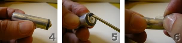 Dopo lo svuotamento io decisi di non ridurre il tubetto di zinco a una lamina, ma di utilizzarlo così com'era. Se volete fare lo stesso, lavate il tubetto cercando di eliminare con uno stecchino tutti i minimi residui interni e lasciatelo seccare. Poi riempitelo fin quasi all'orlo di silicone, evitando che si formino bolle d'aria interne e che il bordo superiore si sporchi, perché poi lo dovrete saldare. Eventualmente proteggete il bordo con un po' di nastro adesivo. Riempire di silicone il tubetto serve per renderlo più resistente, evitare che galleggi nell'elettrolita, che se ne riempia accidentalmente e ne venga corroso dall'interno.
