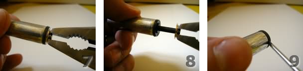 Se volete fare come me, dopo aver aperto e srotolato l'involucro esterno di latta (passi 2 e 3), strappato e rimosso il sottostante foglio di plastica (passi 5 e 6), ruotate ed estraete delicatamente aiutandovi con un paio di pinze (passi 7 e 8) l'elettrodo di carbone di storta corrispondente al polo positivo, che terrete per eventuali futuri esperimenti di elettrolisi o conducibilità elettrica. Poi (passi 9, 10 e 11) dovrete rimuovere il cappuccio e svuotare completamente e accuratamente, con l'aiuto di un cacciavite a lama piatta, il tubetto di zinco dalla sostanza nera che contiene (si tratta di una miscela umida di grafite, biossido di manganese e cloruri di ammonio e di zinco, che potrete racchiudere in un contenitore ermetico per non farla seccare se vorrete utilizzarla in futuro per costruire una pila Leclanché, o altrimenti sigillare in un sacchettino plastico e buttare nei contenitori delle pile esauste).State attenti mentre svuotate la pila, potrebbe scaldarsi e arrivare a scottare a causa dei cortocircuiti che provocherete durante lo svuotamento, quando strapperete con la punta del cacciavite il sottile strato di carta assorbente che separa lo zinco del polo negativo dalla miscela umida del polo positivo. Vi consiglio perciò di non tenere direttamente in mano il cilindretto di zinco, ma di avvolgerlo con uno straccio. La punta del cacciavite che utilizzerete per svuotare la pila potrebbe annerirsi e non potersi più ripulire. Attenti anche a non raschiare con troppa forza per non bucare lo zinco con gli spigoli acuminati della punta del cacciavite.