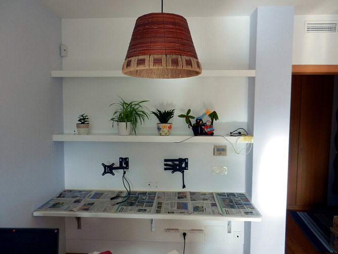 Per me la scelta obbligata era quindi il soggiorno, dove ho una parete di quasi due metri di larghezza, delimitata agli estremi da una colonna e un'altra parete. Uno spazio sufficiente per due postazioni di lavoro, fianco a fianco, con due computer e due monitor.