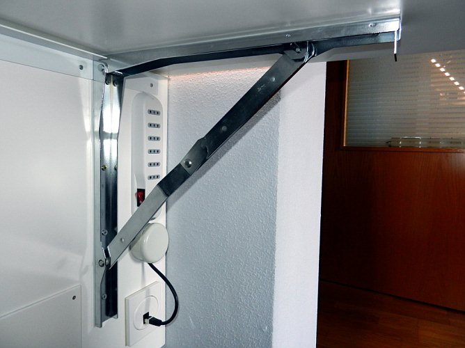 Uno dei tre sostegni che permettono di chiudere il tavolo. Lo sblocco avviene tirando verso di sé la sporgenza alla fine del braccio orizzontale. Il profilo di 3 x 3 cm in PVC bianco che ho avvitato alla parte verticale, visibile in alto, serve a tavolo chiuso per occultare alla vista tutti i cavi, le scatole di derivazione elettriche, le ciabatte multipresa e i sostegni per il PC che ho fissato alla parete e che restano nell'intercapedine di 3,5 cm tra le due tavole in MDF. Si trova a una distanza di circa 7 mm dal piano superiore mobile, in modo che non venga toccato da questo mentre si chiude il tavolo.