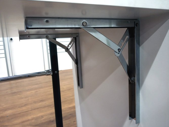 Il tavolo abbattibile si compone di due parti in MDF, una fissa e una mobile, unite da tre squadre d'acciaio che si possono chiudere.