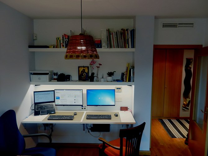 Stavo allestendo un angolo studio per usare il computer nel tempo libero serale, e gli eventi ne hanno accelerato il completamento per utilizzarlo come Home Office. Voglio condividere qui con voi idee e spunti, tecnici e non, per chi volesse realizzare una postazione di studio o lavoro casalinga.