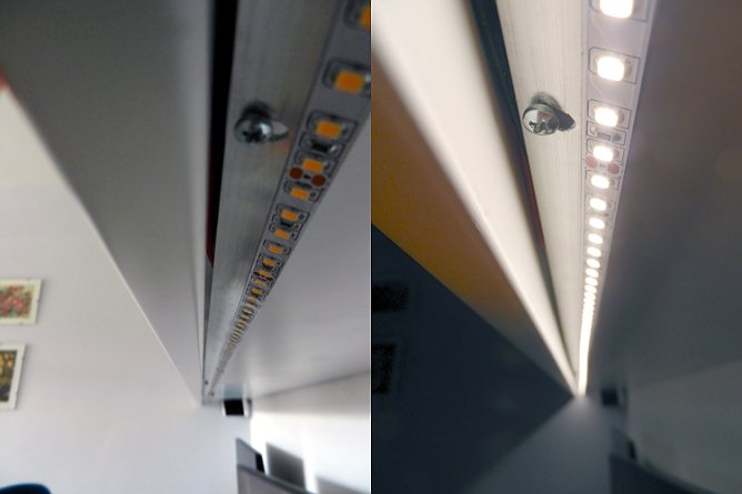 La mensola presenta una "minigonna" di 3 cm che occulta i LED alla vista dell'utente, per impedirne l'abbagliamento.