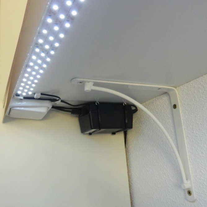 La mia prima "lampada sottomensola", costruita con LED meno potenti, un interruttore extra-piatto e l'alimentatore di una vecchia stampante. Utilizza come "minigonna" anti-abbagliamento un profilo in PVC a "L" di 3 x 3 cm.