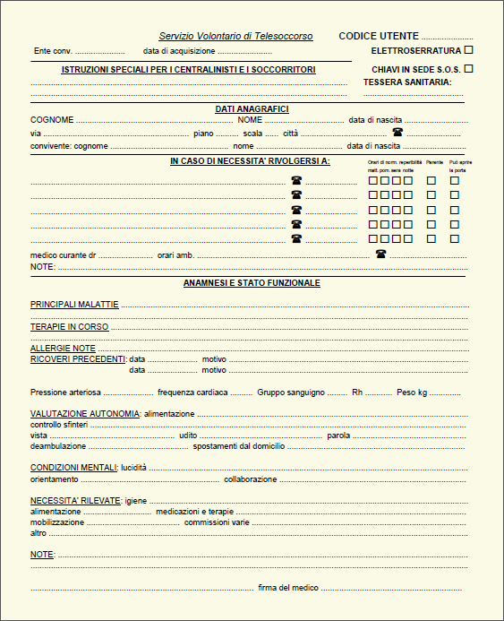 Il potenziale utente, segnalato dai parenti, da associazioni di volontariato o dagli assistenti sociali del Comune riceveva la domanda di collegamento da compilare e firmare e la "Scheda Sanitaria Personale" da far compilare al medico di base, contenente un'anamnesi sanitaria, eventuali farmaci d'urgenza e un insieme di dati anagrafici e personali utili ai soccorritori per attuare rapidamente le azioni opportune. Successivamente il richiedente riceveva la visita di un’assistente sociale e un medico geriatra, entrambi volontari, che ne valutavano l’idoneità al collegamento e completavano la compilazione dei moduli.