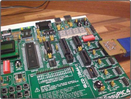 Tuttavia anche qui come in altri casi vale la regola "l'unico standard è l'assenza di standard!" , infatti in rete è possibile trovare un'infinità di documenti forniti da diversi produttori di monitor che prevedono tempi di latenza spesso diversi tra loro. Per quanto riguarda i colori, si può dire che il risultato ottenuto dipende da come si desidera miscelare i tre colori fondamentali rosso, verde e blu. Per questo progetto ho deciso di utilizzare solo 8 combinazioni, non è infatti prevista la variazione dell'intensità di ognuno dei singoli colori di base ma possono solo essere "ON" oppure "OFF". In realtà non sarebbe difficile aumentare il numero dei colori fino a 64 , ma costituirebbe un ulteriore carico per la MCU e non lo ho ritenuto necessario e nemmeno troppo interessante. Per essere più chiaro , mi riferisco all'uso di 6 uscite digitali invece di tre (due per il rosso, due per il verde e due per il blu), usando due partitori di tensione per ogni uscita si potrebbero avere due diverse intensità per ogni colore di base e quindi arrivare ad un totale di 64 colori. Per provare il firmware ho utilizzato una demoboard in mio possesso, si tratta della EasyPic4 prodotta dalla ditta Mikroelecktronika http://www.mikroe.com/ .