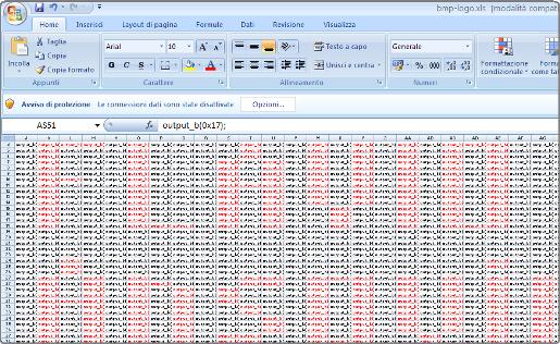 Per realizzare l’immagine mi sono servito di un file excel nel quale ho delimitato un’area di 60X85 caselle. In un’altra pagina ho invece creato una tabella con i codici esadecimali degli otto colori possibili e li ho colorati ognuno con il suo colore. Con copy &paste del colore interessato riesco quindi a scrivere o disegnare forme avendo già un’idea di quale sarà il risultato