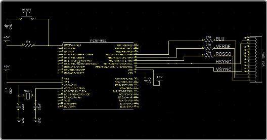 Questa scheda è molto comoda perché funziona come un’interfaccia tra i vari socket disponibili per i diversi controllori e varie periferiche quali LCD, Switch, LED, Display 7 segmenti etc. etc. Il che rende molto rapida la prototipazione. Nel caso si voglia realizzare il progetto descritto su un pcb dedicato, i collegamenti sono comunque molto semplici, non ho utilizzato altro che un micro PIC18F4682, un quarzo da 10MHz con i suoi due condensatori da 22pF al polyestere , due resistenze per i segnali di sincronismo e tre per i colori. Come uscite digitali ho utilizzato quelle della PORTB. Il tutto è cablato secondo il seguente schema elettrico: