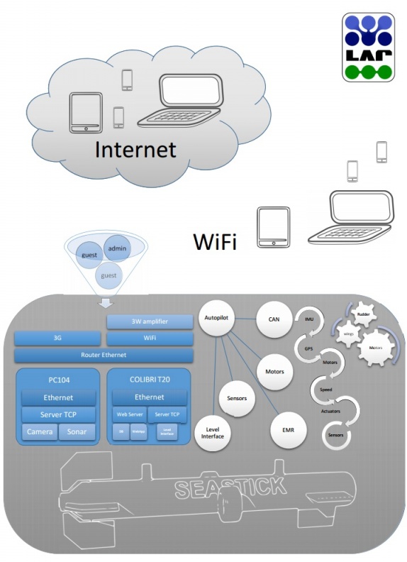 L'ultimo importante aggiornamento fatto riguarda l'interfaccia software del Seastick. All'interno della scheda a microprocessore Colibri abbiamo creato un'interfaccia software tra la rete WiFi/3G e l'hardware di basso livello. Al fine di rendere il Seastick accessibile anche da dispositivi mobili, abbiamo sviluppato un web server interno che consenta l'accesso al software di controllo. Ci è sembrato molto interessante a divulgare informazioni in tempo reale sul web tramite un socket TCP, in modo che un utente collegato come amministratore potesse controllare il veicolo e molti altri utenti collegati come ospiti potessero osservare in tempo reale lo svolgimento della la missione, le immagini sonar, la traccia GPS o la telecamera interna.