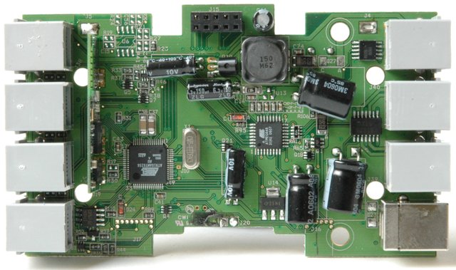 Ognuna delle tre porte di uscita mette a disposizione due uscite PWM per il controllo del motore comandate dal uC ATMEL e l’alimentazione. Inoltre ci sono due ingressi “Tacho” con funzione Trigger di Schmitt per il feedback dell’encoder, che vanno direttamente sull’ARM7 e l’alimentazione per il motore. Ognuna delle quattro porte di ingresso è connessa direttamente all’ARM7 e mette a disposizione oltre all’alimentazione per i sensori, due ingressi digitali e un’uscita analogica, che però può anche funzionare come un segnale in corrente di uscita. L’ingresso analogico vanta un ADC a 10bit ma, in caso si setti la porta come uscita di corrente può fornire fino a 20mA (per porta). I due ingressi digitali di ogni porta possono anche essere utilizzati come bus I2C a 9600 bit/s, con la limitazione che di funzionare solo come Master. Solo la porta di ingresso numero 4 ha anche la possibilità di diventare una porta ad alta velocità basata su protocollo seriale RS485. Anche se non ancora utilizzata dalla Lego, questa funzionalità a mio parere apre grandi prospettive di interfacciamento bidirezionale con dispositivi di natura eterogenea.