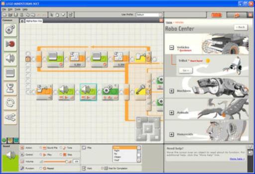 La caratteristica peculiare di questa serie sono i componenti elettronici a disposizione per dare “intelligenza” ai progetti, siano essi macchine , robot o veicoli. Nella scatola è presente un blocco che gestisce la logica, il mattoncino intelligente, al quale si possono connettere alcuni sensori. I sensori forniti nella scatola sono un sensore tattile(…un pulsante.. nella ver. educational che ne sono 2), un sensore di luminosità, un sensore ad ultrasuoni ed un microfono. Questi possono essere connessi ai 4 ingressi del mattoncino intelligente tramite gli appositi cavi (tipo cavi telefonici ma a 6 fili e un connettore RJ11 ma con la linguetta spostata a destra ). Inoltre sono presenti 4 motori comprensivi di encoder da connettere alle 3 uscite. Il blocchetto CPU (.. mi sono stancato di chiamarlo intelligente.. per adesso non lo è ancora..) è provvisto di un display monocromatico, 4 pulsanti gommosi e la porta USB per la connessione al PC. La connessione si può anche stabilire con l’interfaccia bluetooth. La Lego fornisce un software per la programmazione della CPU. In realtà è stato sviluppato dalla National Instruments, quelli che producono LabView per capirci, ed infatti i due sw si somigliano molto. Ovviamente quello realizzato per la Lego è molto più semplice, è comunque sempre un linguaggio di programmazione a blocchi grafici. Significa che come nel LabView per scrivere il proprio codice si cablano letteralmente dei blocchi, ognuno con la sua particolare funzione, ci sono blocchi condizionali, blocchi di I/O , matematici etc.. Affinchè sia possibile riprodurre i normali costrutti di programmazione ogni blocco possiede una propria configurazione.