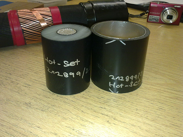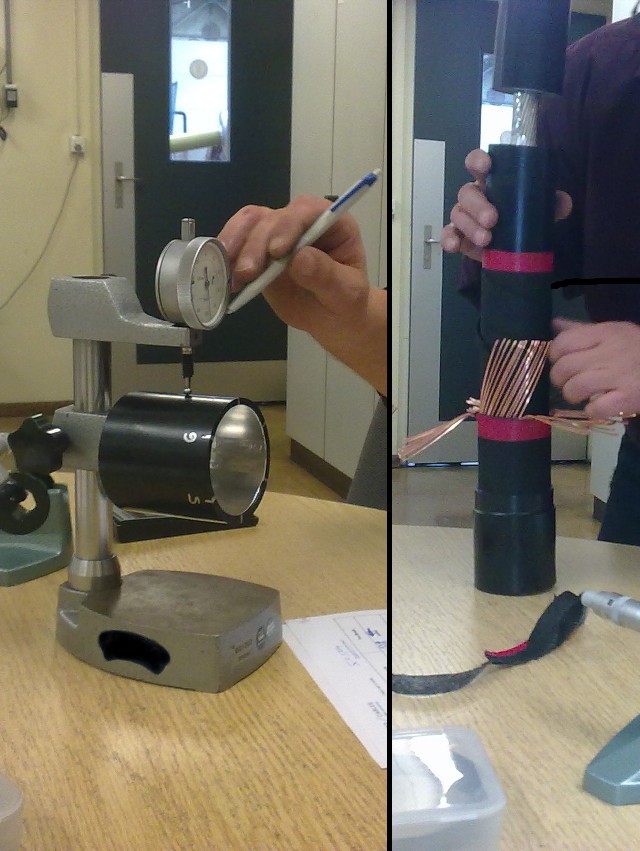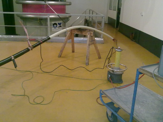 Di seguito potete guardare delle foto che ho scattato durante l'esecuzione di alcuni test su un cavo AT, se non ricordo male era un cavo da 150 kV. Nella prima e nella seconda foto vediamo i vari strati e materiali che compongono il cavo, dalla guaina esterna, all'armatura, allo schermo metallico, allo strato semiconduttivo e al conduttore. Nella terza sono mostrate le misure dimensionali sullo spessore dei materiali e conteggio dei cavi costituenti lo schermo. Nella quarta e nella quinta prove elettriche sul cavo. Quindi nella sesta analisi dimensionali. Nella settima i collari di fissaggio. Quindi il test di allungamento del materiale sottoposto a trazione. Infine una delle fasi di produzione e le bobine in magazzino.