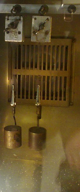Con questo test si determina l'allungamento del materiale quando sottoposto a trazione ad alta temperatura. Si vede poco perchè è quasi trasparente, ma fra le pinze con le masse nella parte inferiore e le morse superiori ci sono i campioni del materiale sotto test.