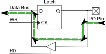 | Fase MODIFY del Read-Modify-Write, il bit 1 del registro interno viene modificato. Il bit 0 rimane quello che è stato letto dal pin, quindi 0. | |