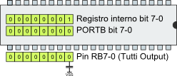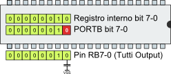 In questa condizione portiamo il livello logico di RB0 ad 1: PORTBbits.RB0 = 1; | |