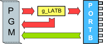// A livello globale, ad esempio nel main.c dichiariamo una variabile che fa da latch: unsigned char g_LATB = 0x00; // Dichiariamo una macro (o in alternativa una funzione) che copia questa variabile su PORTB: #define f_Write_LATB_PORTB() PORTB = g_LATB