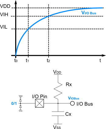 Se il pin è collegato ad un componente passivo non ci sono problemi, ma se il pin è collegato ad un bus ( es. I2C ) o ad un altro dispositivo ( es. il gate di un FET ) che presentando delle capacità parassite rappresentano un carico di tipo capacitivo, la sistuazione si complica. Se nel'istante t0 abbiamo cambiato lo stato da 0 ad 1, dovremmo attendere fino a t2 prima che il valore logico letto sul bus corrisponda allo stato 1, ma se avviene un RMW prima di t1 ecco che il valore che verrà letto sarà uno 0, che verrà riscritto nel latch della porta. Questo problema si presenta tanto più in questi casi: