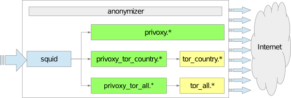 in questa image è installato privoxy. Privoxy è un proxy che non fa cache dotato di funzionalità avanzate di filtri che aumentano la privacy, modifica le pagine web e gli header HTTP, controlla gli accessi, e rimuove pubblicità e spazzatura dalle pagine web. E' configurato per accettare richieste da squid ed inoltrarle al sito di destinazione o attraverso la rete tor. Questa image genera 3 tipi di services: