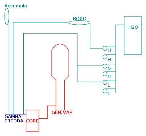 Passando da H a L, la portata delle pompe aumenta. Infatti per tipologie di rotture che vedono la perdita di molto fluido, si necessitano di pompe ad alta portata con bassa pressione, perchè quello che serve è quantità di fluido che rimpiazzi quello eventualmente uscito dal circuito di raffreddamento, viceversa, se la rottura è piccola, ed esce poco fluido, serve alta pressione e poco rimpiazzo di fluido. Vi è un parallelo sistema che è costituito da un serbatoio di acqua borata (il Boro è un ottimo moderatore che spegne velocemente le reazioni nucleari) che viene pompata in caso servisse. Sia nel BWR che nel PWR, ci sono degli spruzzi di ugelli dall'alto della struttura che spara acqua di raffreddamento. In realtà il sistema è molto più complesso dell'illustrato: ne inserisco una parte schematizzata.