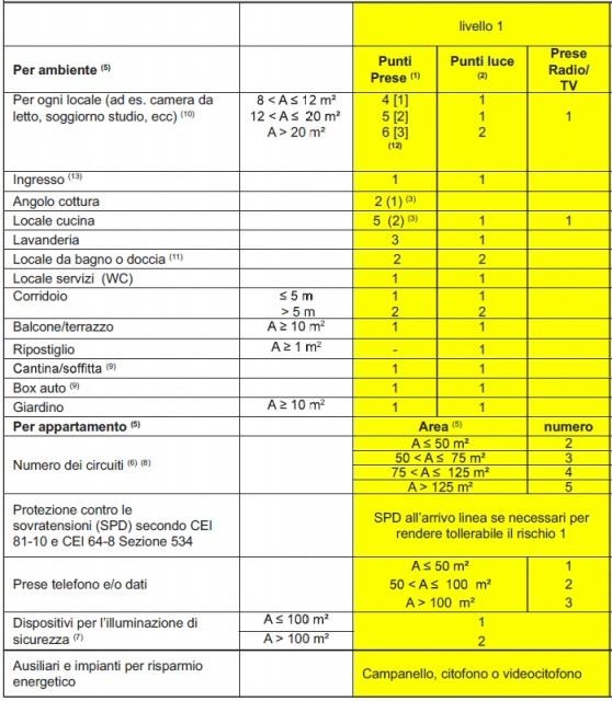 •il Livello 1 individua la dotazione minima cosi che l’impianto elettrico possa considerarsi conforme alla norma CEI 64-8. Sotto tale livello non è consentito scendere.