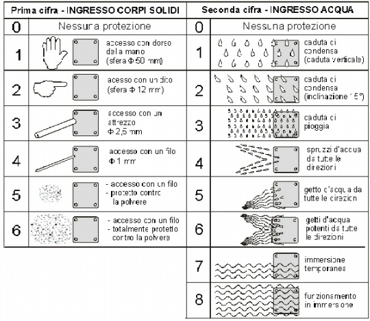 - protezione contro i contatti diretti, per quanto concerne gli involucri e le barriere detta protezione viene eseguita rispettando soprattutto il grado di protezione IP degli impianti: