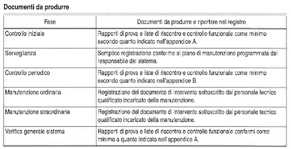 Almeno una copia delle liste di controllo deve essere conservata dal responsabile del sistema e allegata al registro della manutenzione e dei controlli.