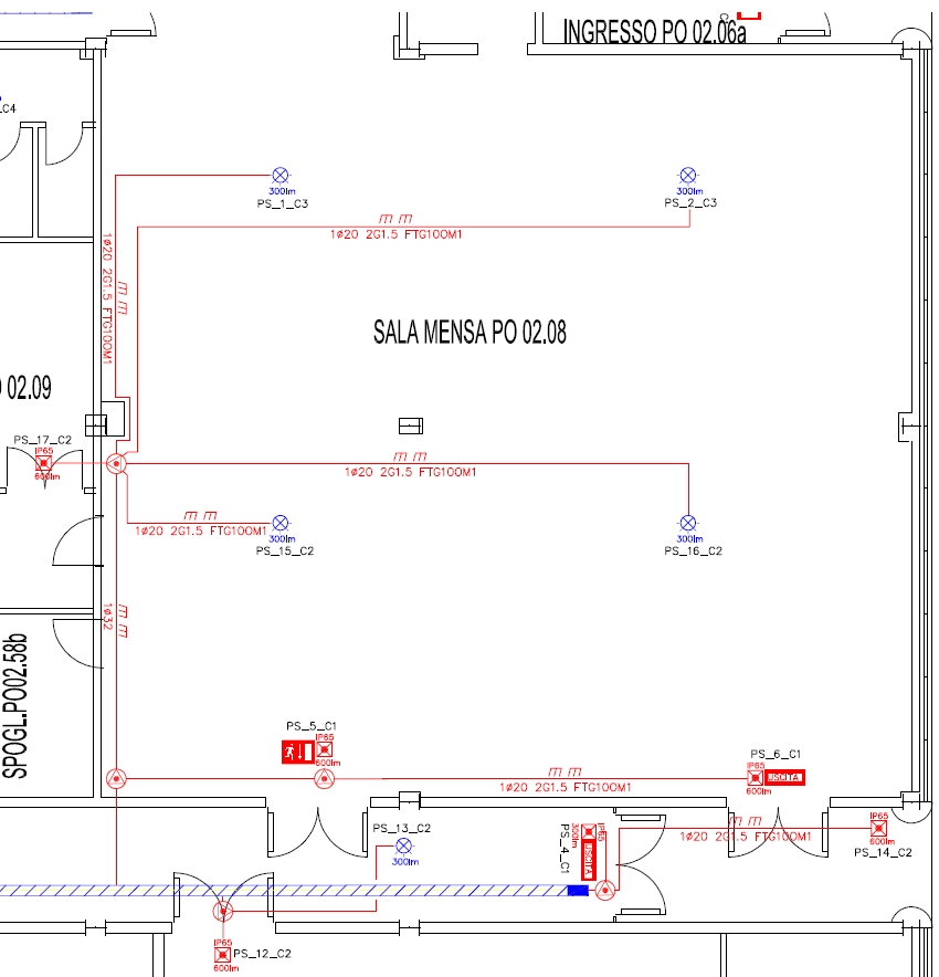 Dati: Il progetto propone la realizzazione dell’impianto di illuminazione di sicurezza di un edificio ad uso uffici e laboratori, con un gruppo soccorritore Lps ( Low Power Supply)unico ed autonomo, utilizzando degli apparecchi per l'illuminazione di sicurezza a LED da 300lm, 600lm e spot da incasso. Per la distribuzione dell’energia nell’impianto elettrico di cui in oggetto è previsto l’uso dei seguenti cavi: FTG10OM1, cavo flessibile per energia resistente al fuoco, isolato con gomma di qualità G10, sotto guaina termoplastica speciale di qualità M1, esente da alogeni, non propagante l’incendio e a basso sviluppo di fumo