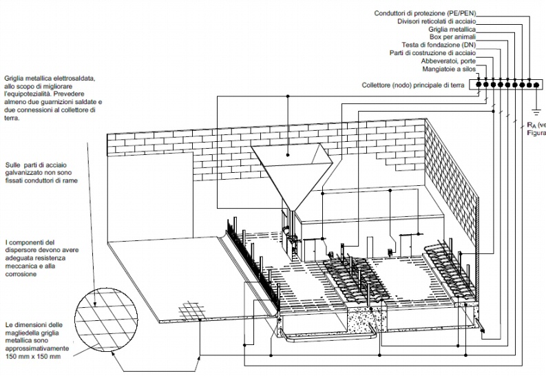 In un luogo destinato alla custodia di animali, i collegamenti equipotenziali supplementari devono connettere tutte le masse e le masse estranee che possono essere toccate dagli stessi animali, ed il conduttore di protezione dell’impianto.