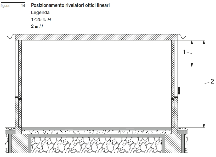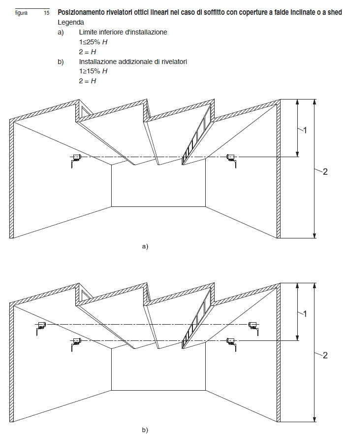 Nel caso di soffitto con coperture a falde inclinate o a shed, i rivelatori ottici lineari possono essere installati in senso parallelo all’andamento oppure in senso trasversale. Se in senso trasversale la h dello shed, doppia falda o elemento sporgente deve inferiore al 15% della H totale. Se non fosse così si deve aumentare del 50% il numero dei rivelatori. Per locali alti fino a 12m i rivelatori possono essere installati ad un’altezza pari al 25% della H max del locale Installazioni con H del soffitto sup. a 12m si deve effettuare prove di funzionamento oppure rivelatori a quote intermedie. Massima distanza tra 2 livelli di rivelazione 12 metri