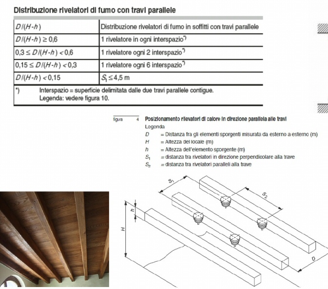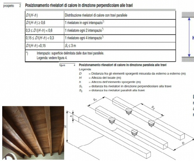Nel caso di soffitto con travi a vista i rivelatori devono esser posti all’interno dei riquadri, tenendo però conto di queste eccezioni: