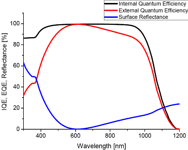 Le perdite di rendimento per riflessione sono causate dal fatto che la cella solare non essendo un corpo nero, restituisce parte della radiazione incidente all’atmosfera senza che abbia formato portatori di carica. Nel linguaggio tecnico odierno è di uso comune chiamare “external quantum efficiency” la funzione prodotto tra la “internal quantum efficiency”, cioè il rendimento quantico della cella ideale e il coefficiente di riflessione della cella reale. In questo modo viene definita un’unica funzione che al variare della lunghezza d’onda fornisce il valore reale di efficienza quantica. L’andamento qualitativo delle 3 grandezze principali caratterizzanti una cella solare è espresso dal grafico in figura 3 ( Fonte: Wikipedia)