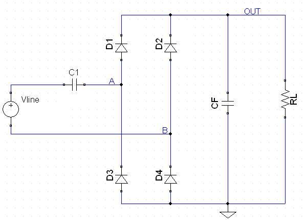 Quando la tensione di linea sale, la corrente scorre nel condensatore verso destra, e vengono accesi i diodi D1 e D4. Durante questo periodo la tensione VAB è quindi uguale alla tensione di uscita (supposta costante) più la caduta sui diodi. Nel semiperiodo successivo, quando la tensione di linea scende, la corrente inverte il senso di percorrenza e si accendono i diodi D2 e D3 e la tensione all'ingresso del ponte vale