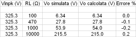Le tensioni di uscita calcolate con l'equazione (4) e misurate nel circuito reale con diversi carichi sono riportate nella tabella seguente. Anche in questo caso si sono assunti 2V di caduta sui diodi.