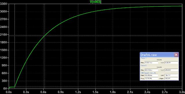 Il grafico della tensione di uscita rimane a 6.3V circa finché il carico è connesso. Quando a t=0.1s il carico viene scollegato, la tensione di uscita Vo sale esponenzialmente fino a 323V. La costante di tempo (cioè il tempo impiegato dalla tensione per percorrere il 63.2% della variazione) e visualizzato dai cursori, risulta essere di 520ms circa, mentre l'equazione (6) fornisce un valore