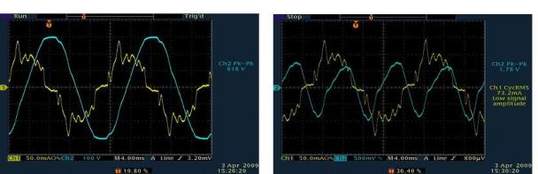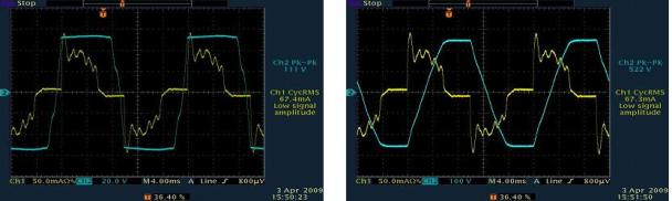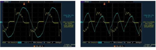In questo caso l'errore è maggiore, a causa della distorsione della tensione di rete e delle non indealità dei componenti. Nelle figure seguenti sono riportate nella foto di sinistra la tensione di rete (blu) e la corrente assorbita dalla rete (gialla), nella foto di destra la tensione di ripple (blu) e la corrente (gialla), per il carico da