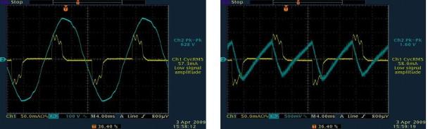 Carico 10 kohm. - Sinistra: Tensione di rete e corrente assorbita. Destra: corrente assorbita e tensione di ripple (la tensione di ripple è a rovescio, per errore di connessione del probe!)