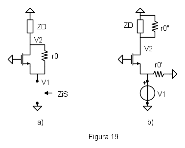 D'altra parte però il teorema di Miller "standard" è importante nei problemi per il calcolo dell'impedenza di ingresso e pare brutto non mostrarne un esempio. Per questa ragione in questa sezione si userà il teorema di Miller per valutare in modo approssimato l'impedenza vista nel source di un MOS quando è presente l'effetto di modulazione della lunghezza di canale (impropriamente detto nel MOS effetto Early) e una resistenza di carico sul drain. Il circuito di riferimento è in figura 15a, dove si considera un MOS ideale e si mette in evidenza, disegnandola fuori dal dispositivo, la sua resistenza