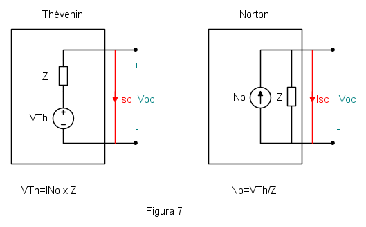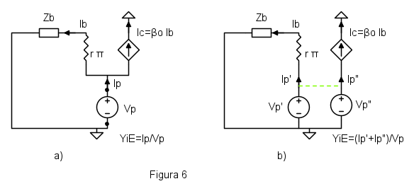 ai morsetti sui quali si vuole trovare l'impedenza e si spengono tutti gli altri generatori indipendenti. Si calcola la corrente che esce dal positivo del generatore di tensione e il rapporto dà l'ammettenza ai morsetti, come mostrato in figura 6a, dove si è provveduto a girare i segni delle correnti.
