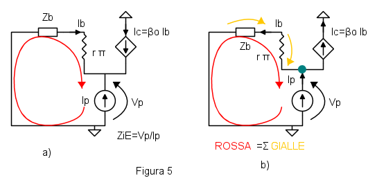 Per trovare la tensione ai capi del generatore di corrente di prova bisogna usare una maglia di tensioni che non passi per il generatore di corrente controllato, altrimenti avremmo una tensione incognita in più. La maglia da utilizzarsi è in figura 5a, dalla quale si riesce a calcolare la tensione ai capi del generatore di corrente