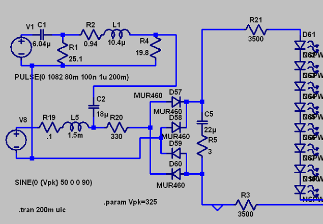 fanno ben sperare in questo senso. E` possibile fare una stima degli stress in gioco sui led usando la semplice elettrotecnica. Per gli stress sul condensatore e resistenza di ingresso ci vuole l'elettrotecnica un po' piu` complicata, e la lascero` al simulatore.
