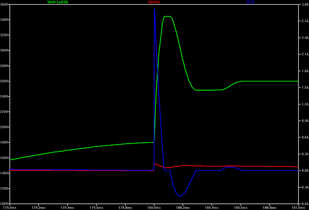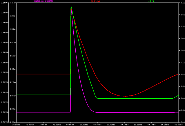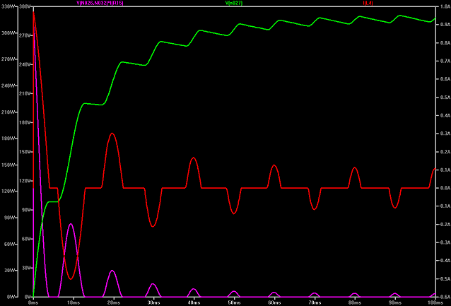 dove con partenza da spento, in verde e` rappresentata la tensione sul condensatore, in rosso la corrente assorbita dalla linea e in viola la potenza istantanea dissipata da