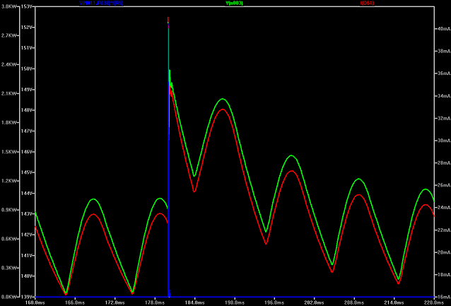 La traccia verde e` la tensione complessiva sui led, con il suo ripple. In corrispondenza del surge sale di
