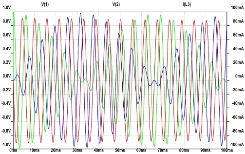 Si vede che anche qui le tensioni V1 e V2 sui due condensatori oscillano ma si cambiano di ampiezza, mentre la corrente nella induttanza L3 che accoppia i due circuiti rimane di ampiezza costante.