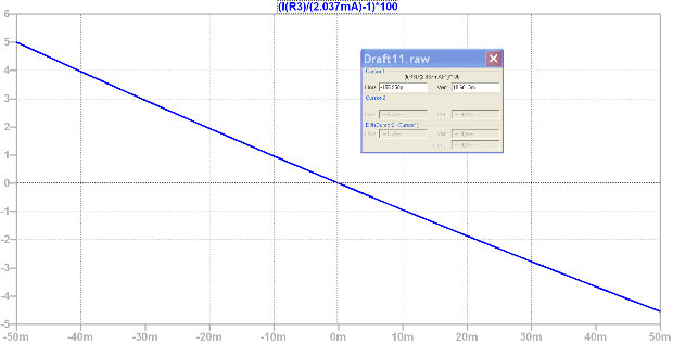 In ascissa e` rappresentata la percentuale dell'errore della tensione di alimentazione, in ordinata l'errore percentale della corrente di collettore: in questo caso in perfetto accordo con i conti.