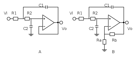 Il circuito A usa un voltage follower, lo schema B un amplificatore con guadagno maggiore di 1, e fornisce al progettista un grado di liberta` in piu`. Le funzioni di trasferimento dei due circuiti sono per il circuito A: