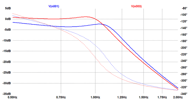 Nella realizzazione di un filtro di ordine elevato, e` necessario realizzare celle del secondo ordine, come quella trattata qui, con un discreta precisione, altrimenti la funzione di trasferimento del filtro non risulta quella voluta. Nella figura seguente e` rappresentata in rosso la funzione di trasferimento ideale di un filtro di Chebyshev del quarto ordine, frequenza normalizzata a 1Hz e ripple in banda di 1dB, e in blu lo stesso filtro con tolleranze sui componenti dell'ordine di svariati percento.