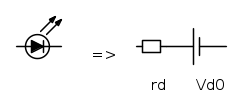 Dalle caratteristiche del led che danno 1.9V @ 7mA e 2.2V @ 20mA, e` possibile ricavare un modello lineare formato da una batteria con una resistenza in serie:
